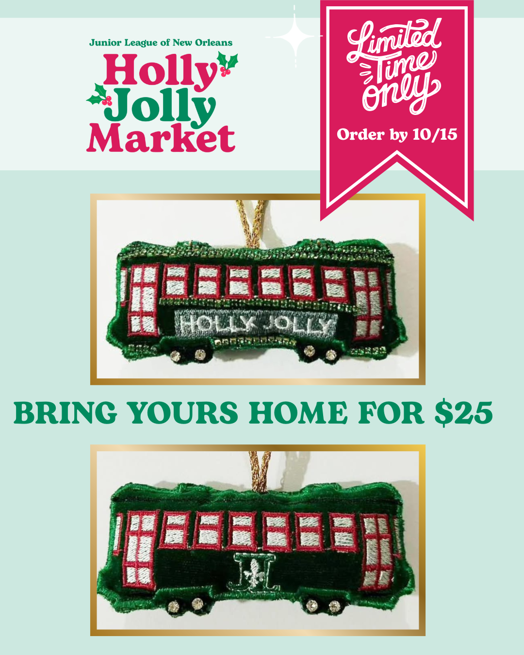 NEW FOR 2025! We’ve partnered with Golden Lily to create a limited-edition JLNO Holly Jolly Market ornament that is available by pre-order only for just $25! Don’t miss your chance to add this custom keepsake to your holiday collection.